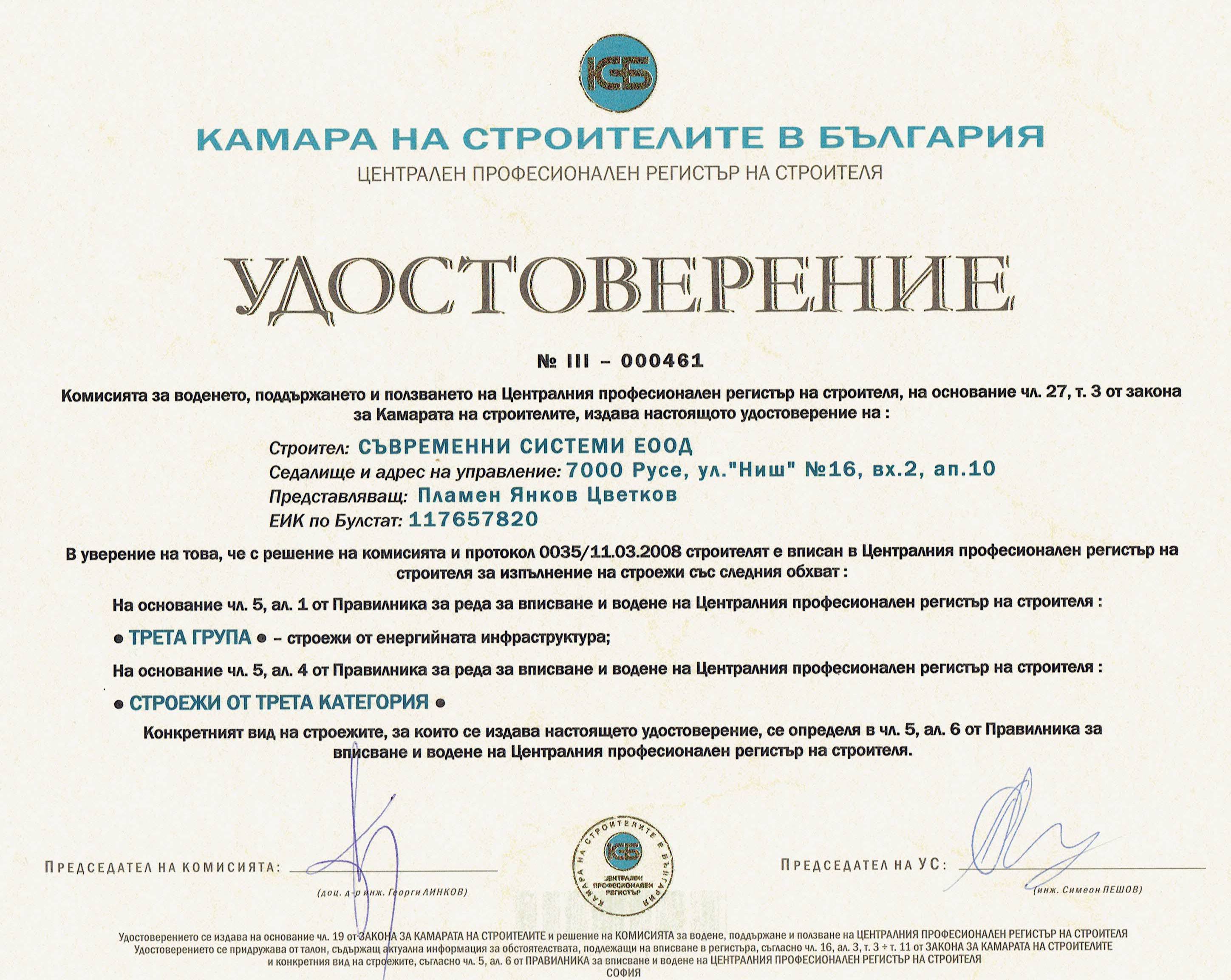 „Съвременни системи“ ЕООД е вписано в Централния професионален регистър на строителя към Камарата на строителите в България.